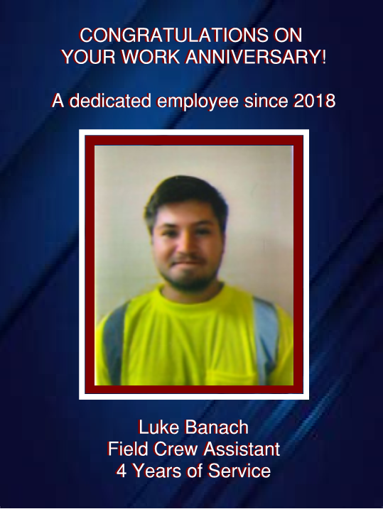 Luke Banach has been a dedicated employee since 2018. He started working here in his junior year of high school. He began scanning files in the office and has worked his way up into being a Field Crew Assistant. He now assists in both boundary and construction surveying projects and occasionally acts as Field Crew Chief. In his free time he enjoys singing in the church choir, playing sports, and coaching Little League soccer.