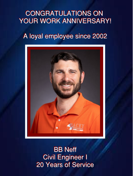 BB has been a loyal employee since 2002. He started at Racey Engineering just as the business began to take off and has been a big part in helping his brother, Pat, and sister in-law, Chris, mold the business into what it is today. BB is currently one of our Civil Engineers, where he drafts plans. In his free time, he enjoys being a Disc Jockey and spending time with his wife, Anna, and step-son, Gavin. Recently, he and his wife built their forever home.