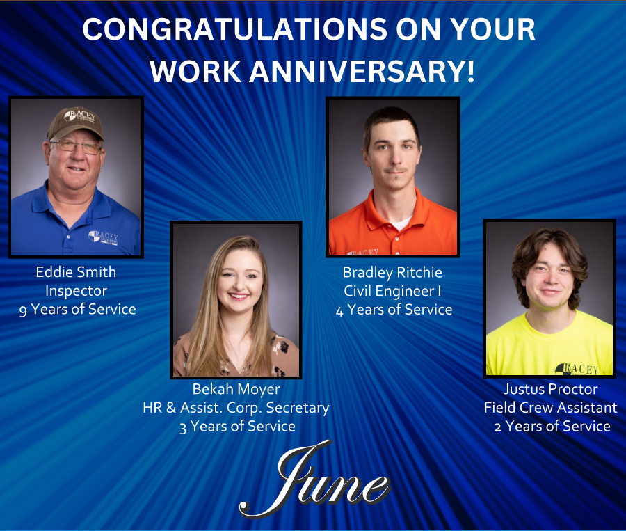 Happy Work Anniversary to our June hire(s); Eddie Smith, Bekah Moyer, Bradley Ritchie, and Justus Proctor!