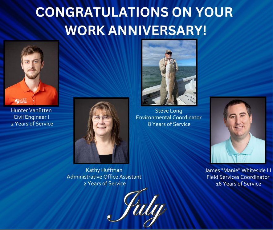 Happy Work Anniversary to our July hire(s); Hunter VanEtten, Kathy Huffman, Steve Long, and James "Manie" Whiteside III!