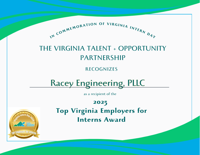 Racey Engineering, PLLC has been selected as a recipient of the 2025 “Top Employers for Interns” Award through Virginia Talent + Opportunity Partnership (V-TOP).